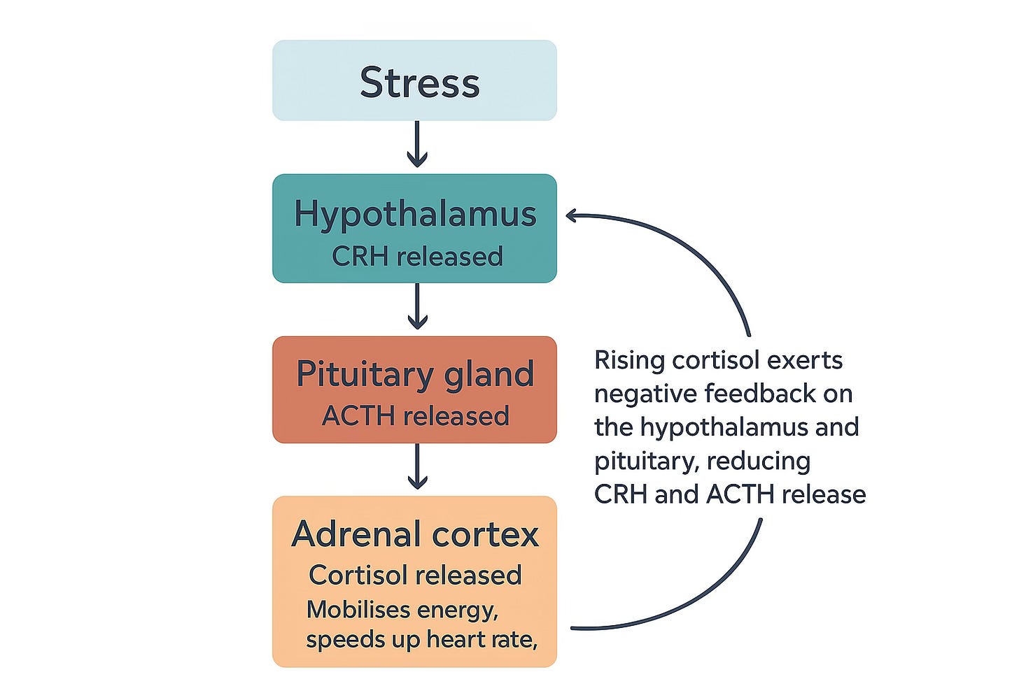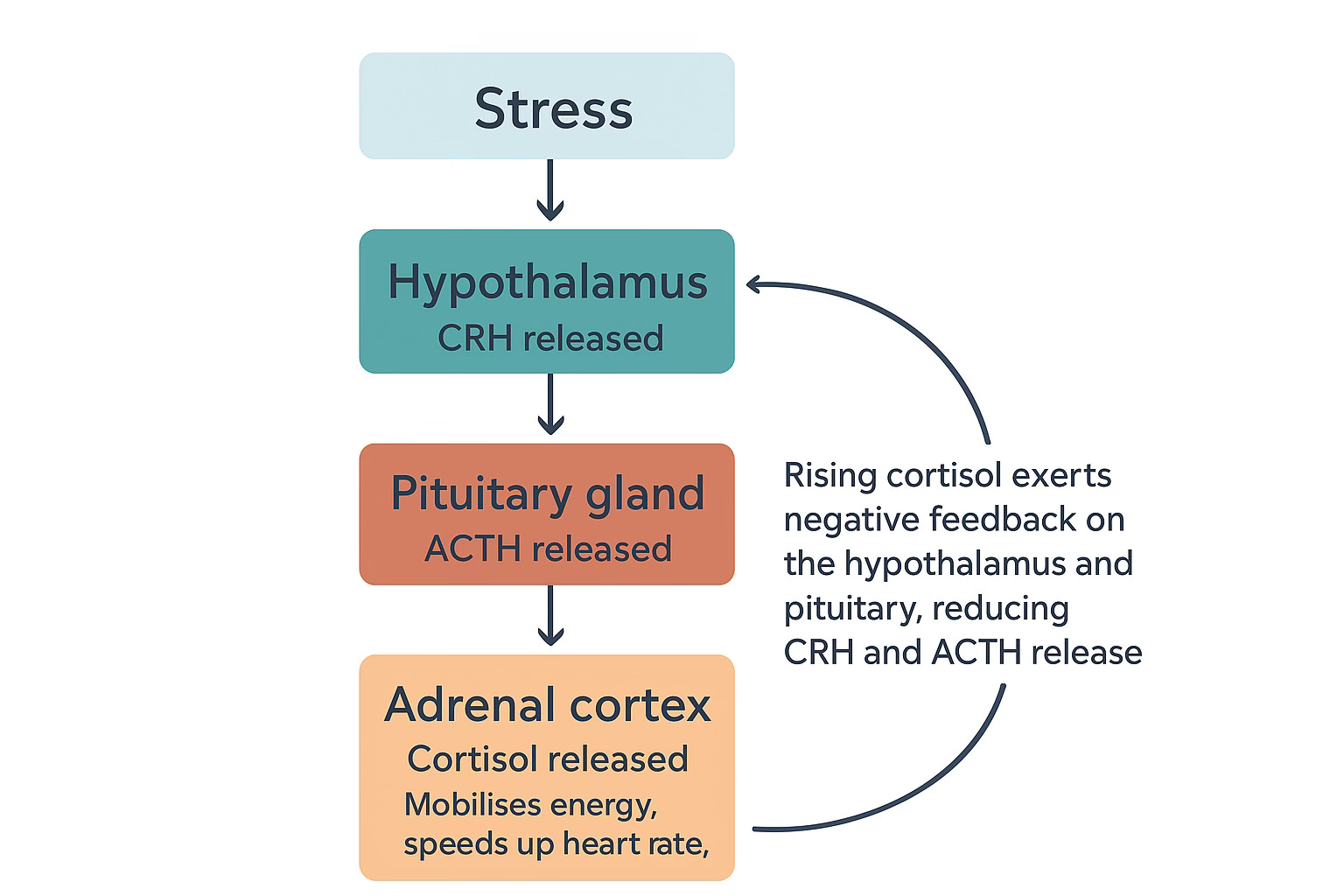 When you experience stress, the body responds immediately. The hypothalamus releases corticotropin-releasing hormone (CRH), which signals the pituitary gland to release adrenocorticotropic hormone (ACTH), prompting cortisol production from the adrenal glands. Cortisol mobilises energy, speeds up the heart rate, and dilates blood vessels to prepare for action. Once cortisol levels rise sufficiently, the hypothalamus senses the feedback and stops producing CRH. The system returns to baseline, the stress response fades.